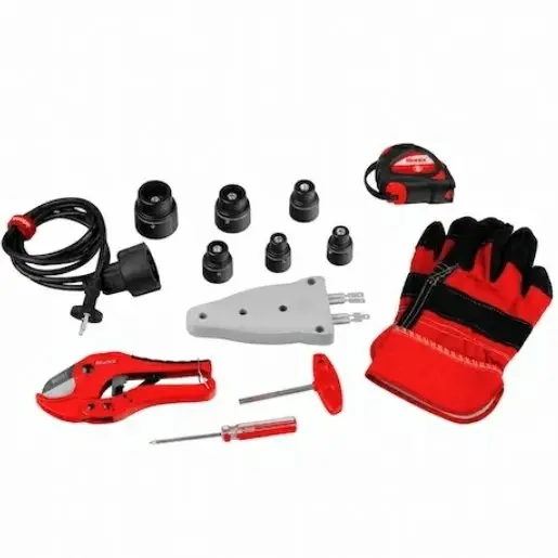 - دارای یک کیف کامل شامل راکت اضافه، دستکش ایمنی، متر، قیچی PVC بُر و آچار که تمام نیازهای شما را در حین عملیات جوشکاری برآورده میکند