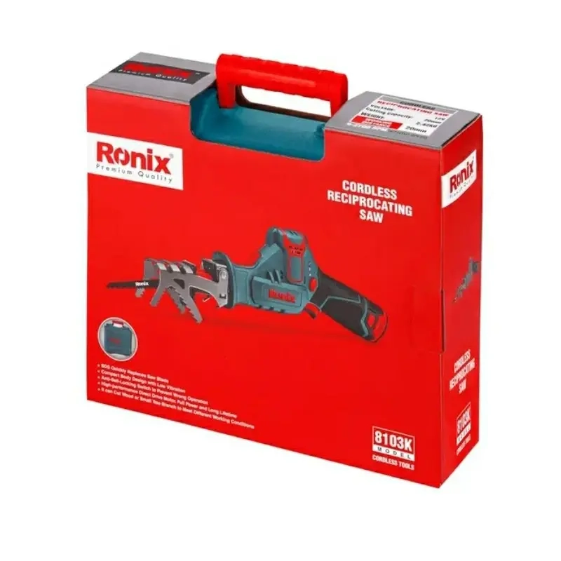 طراحی اره همهکاره یا افقیبر شارژی 8103K رونیکس و ساختار لولهایشکل آن، استفاده از این ابزار را در فضاهای با دسترسی محدود امکانپذیر میکند. این اره به یک موتور 12 ولت DC کوچک اما قدرتمند و با راندمان بالا تجهیز شده است. در این محصول شارژی، از باتری لیتیوم یون 12 ولت با ظرفیت 2 آمپرساعت به عنوان منبع تغذیه استفاده میشود. ابزارگیر این اره افقیبر، اتوماتیک بوده و تعویض سریع و آسان تیغه را برای کاربر امکانپذیر میکند. افزونبراین، در قسمت بالایی این ابزارگیر، میتوان پایهای را برای باغبانی و شاخهزنی نصب کرد.