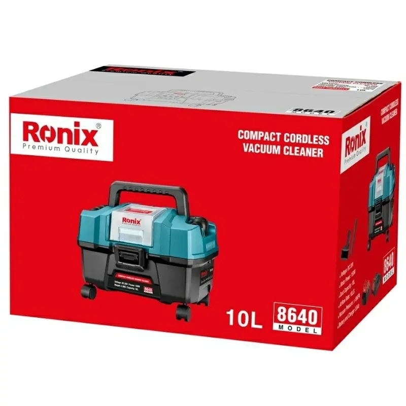 جارو شارژی 10 لیتری رونیکس مدل 8640 دارای توان 20 ولت برای جمع آوری خشک و تر، دستگاهی قابل حمل دارای چرخ برای حمل و نقل آسان، دارای قابلیت نظافت سطوح خشک و مرطوب، دارای مکش فوق العاده و همچنین دارا بودن در پوش پلاستیکی روی باتری برای جلوگیری از نفوذ آب به داخل باتری را می توان از ویژگی های مهم این جارو شارژی عنوان کرد. این جاروی پر قدرت شارژی مناسب فعالیتهای خانگی، تمیز کاری اتومبیل و… است.