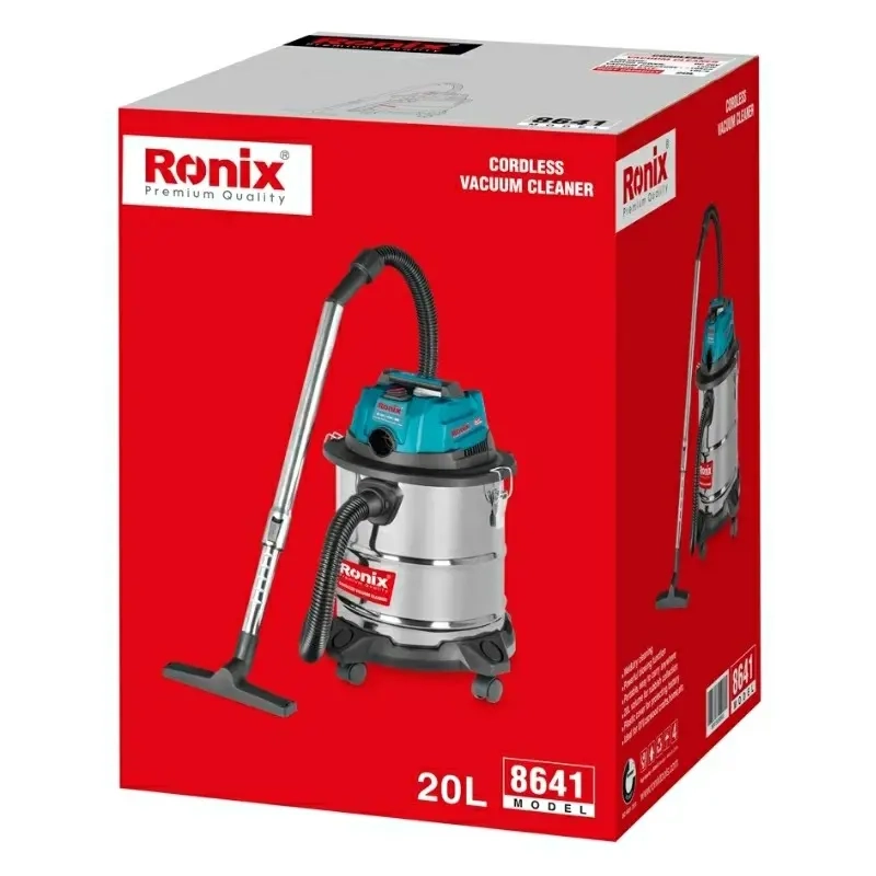 جارو شارژی 20 لیتری رونیکس مدل 8641 دارای توان 20 ولت برای جمع آوری خشک و تر، دستگاهی قابل حمل دارای چرخ برای حمل و نقل آسان، دارای قابلیت نظافت سطوح خشک و مرطوب، دارای مکش فوق العاده و همچنین دارا بودن در پوش پلاستیکی روی باتری برای جلوگیری از نفوذ آب به داخل باتری را می توان از ویژگی های مهم این جارو شارژی عنوان کرد. این جاروی پر قدرت شارژی مناسب فعالیتهای خانگی، تمیز کاری اتومبیل و… است.